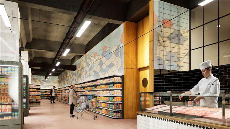 არქიტექტორმა და დიზაინერმა - მოზაიკა, კერამიკა, მინანქარი, ძველი აგური და ბეტონი გამიზნულად შეინარჩუნეს ინტერიერში, რათა შექმნილიყო გარემო, რომელიც სტუმრებს იმ დროის განწყობას ახსენებს და საუკეთესო ემოციებს უბრუნებს. ავთენტურობის ეს განცდა კი გადამწყვეტ როლს ასრულებს სასიამოვნო სავაჭრო გამოცდილების უზრუნველყოფაში.