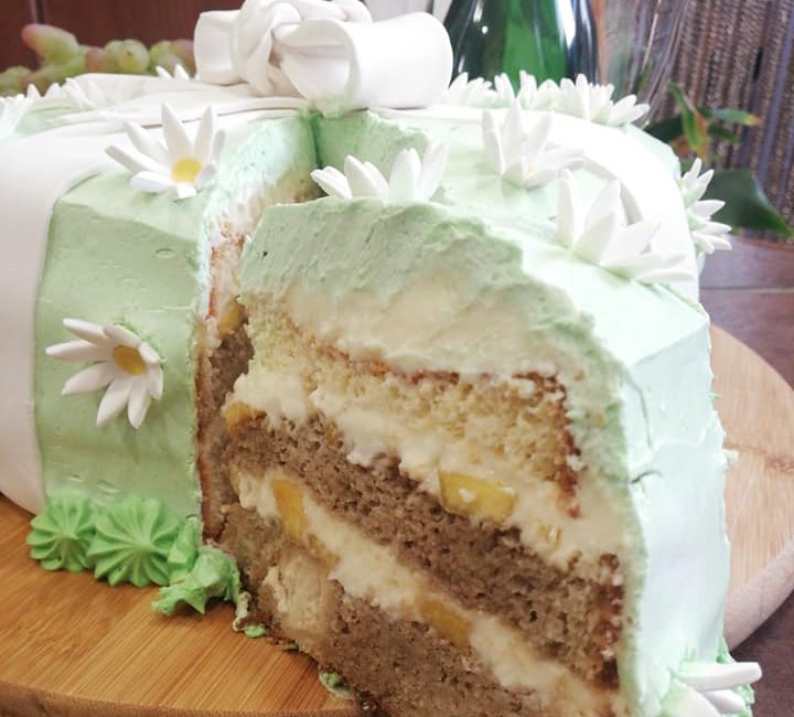 1. მოამზადეთ ბისკვიტი: 1.მოაყარეთ კვერცხის ცილას ცოტა მარილი და ამოიყვანეთ მასის გამყარებამდე. 2. დაამატეთ შაქარი, კვერცხის გულები, ვანილი, ფქვილი და ხის კოვზით მოურიეთ ერთი მიმართულებით. გამოაცხვეთ კალკა ცხიმწასმულ 28დმ ფორმაში, 160 გრადუსზე. 2. მოამზადეთ კრემი: 1. ამოიყვანეთ გათეთრებამდე კვერცხის გული და შაქარი. დაამატეთ: სახამებელი, ფქვილი, ვანილი, რძე და წამოადუღეთ. დააფარეთ სამზარეულოს პოლიეთილენის პარკი. 2. ამოიყვანეთ კარაქი გათეთრებამდე და დაამატეთ თითო კოვზი გაციებული ფაფა. 3. გაყავით ბისკვიტი სამ ნაწილად. ორი ფენა დანამეთ ყავით და კონიაკით. დაალაგეთ კუბიკებად დაჭრილი ატამი. ყველა ფენას წაუსვით კრემი. 10 წუთი გააჩერეთ საყინულეში და გარედან წაუსვით მწვანე კრემი. 4. ტორტი მორთეთ მარციპანით და პატარა გვირილებით.