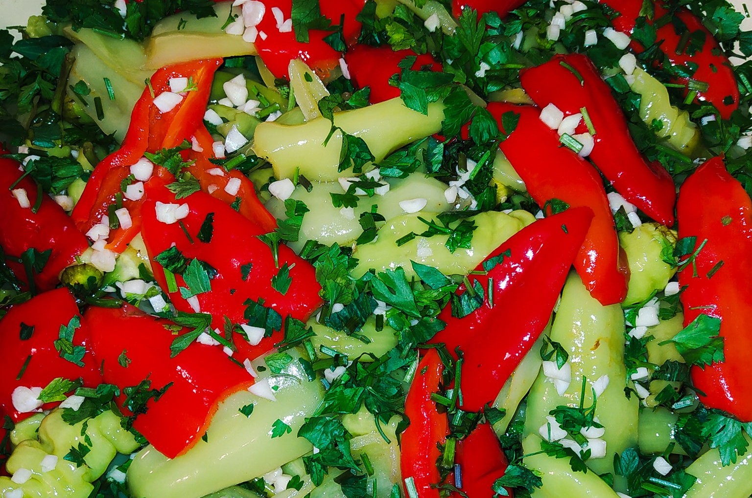 1. სუფთა და გარჩეული წიწაკები გააშრეთ კარგად, დაუსერეთ ბოლოები ან დაჩხვლიტეთ ალაგ–ალაგ ჩანგლით და გაამზადეთ შესაწვავად. 2. ჩაასხით მოზრდილ ქვაბში ზეთი და დაამატეთ: ძმარი, შაქარი, მარილი, შავი წიწაკის კაკლები, დაფნის ფოთოლი. მოურიეთ კარგად. 3. ადუღდების შემდეგ ჩაყარეთ წიწაკები, გააჩერეთ რამოდენიმე წუთით, სანამ ფერს არ იცვლის ყუნწებთან. 4. ამოწურეთ და დაყარეთ მოზრდილ ჯამზე, თან გამზადებული გქონდეთ დაჭრილი ნიორი, ერთი კონა ნიახური და ოხრახუში. 5. ცხელ მასას მოაყარეთ ნიორი და მწვანილი, ასე გააგრძელეთ წიწაკის დამთავრებამდე. 6. ყოველ ამოღებაზე ფენა–ფენად მოაყარეთ მწვანილი. ბოლოს მოწვით გრძლად დაჭრილი წითელი ბულგარული. 7. ყველაფერი აურიეთ კარგად და ჩადეთ ქილებში. დაასტერილეთ 10 წუთის განმავლობაში და მოხუფეთ. შეგიძლიათ არ გამოიყენოთ ასპირინი.