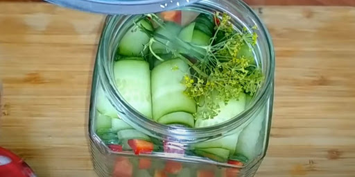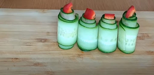 გამოიყენეთ გრძელი, დაახლოებით 12 –15 სმ სიგრძის, კიტრი. სამზარეულოს სათლელით დათალეთ თხელ ფენებად. დაჭერით ბულგარული წიწაკა წვრილ და მოგრძო ნაჭრებად. ბულგარული წიწაკის ნაჭერი მოათავსეთ კიტრის ფირფიტის თავში და დაიწყეთ გადახვევა, როგორც ფოტოზეა. გასტერილებულ ქილაში ჩაქარეთ: 1 კბილი დაჭრილი ნიორი, 1 ჩკ მდოგვის მარცვლები, 1 ჩკ კამის თესლები და გამზადებული რულეტები ჩაალაგეთ ქილაში. ბოლოს დაამატეთ ცერეცოს ყვავილი და დაასხით ცხელი წყალი. დააფარეთ თავსახური, დაელოდეთ 15 წუთით და დაიწყეთ მარინადის მომზადება. ქილიდან სითხე გადაასხით ქვაბში, 1 ლიტრზე დაამატეთ 1 სკ მარილი, 3 სკ შაქარი და 10 მლ ძმარი, აადუღეთ, ჩაასხით ისევ ქილებში და კარგად მოხუფეთ.