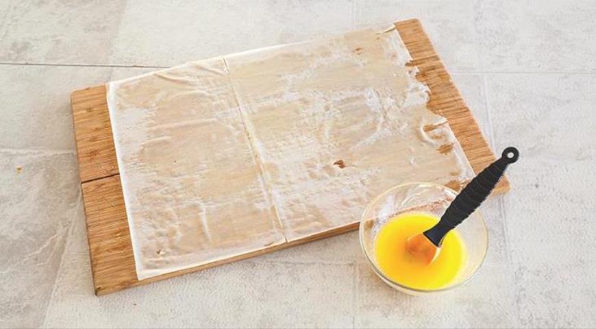 გაახურეთ ღუმელი 200 ° C- ზე, წვრილად დაჭერით ხახვი და წიწაკა. ტაფაზე გაათბეთ ზეითუნის ზეთი, შეწვით ხახვი, სანამ ოქროსფერი არ გახდება. დაუმატეთ დაჭრილი ხორცი და წიწაკა, მოშუშეთ საშუალო ცეცხლზე სანამ დარბილდება, დაგჭირდებათ 7-10 წუთი. დაუმატეთ ქინძი და დარიჩინი, მოაყარეთ მარილი და პილპილი. შემდეგ გააგრილეთ, დაამატეთ წვრილად დაჭრილი ოხრახუშისა და პიტნის ფოთლები და კარგად მოურიეთ. ამოიღეთ ფილოს ცომი შეფუთვიდან და მოათავსეთ დანამულ სამზარეულოს დაფაზე, წაუსვით გამდნარი კარაქი. გადაკეცეთ ცომი და მოათავსეთ 1 სკ მზა მასა კიდეზე, მიეცით სამკუთხედი ფორმა და შეახვიეთ მანამ, სანამ ბოლომდე არ დაიფარება შიგთავსი ცომით. მოამზადეთ ყველა ღვეზელი ამ გზით. განათავსეთ ღვეზელები საცხობ ფორმაზე და წაუსვით გამდნარი კარაქი. გამოაცხვეთ წინასწარ გახურებულ ღუმელში, დაახლოებით 10 წუთით, სანამ არ მიიღებს ოქროსფერ შეფერილობას.