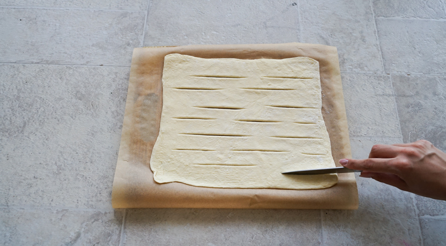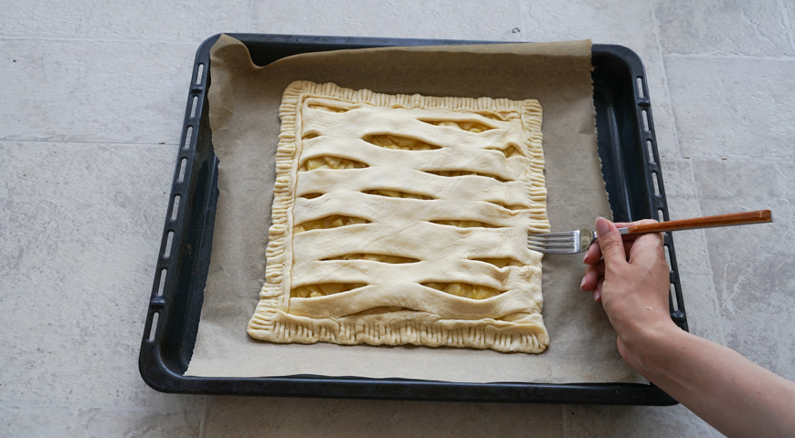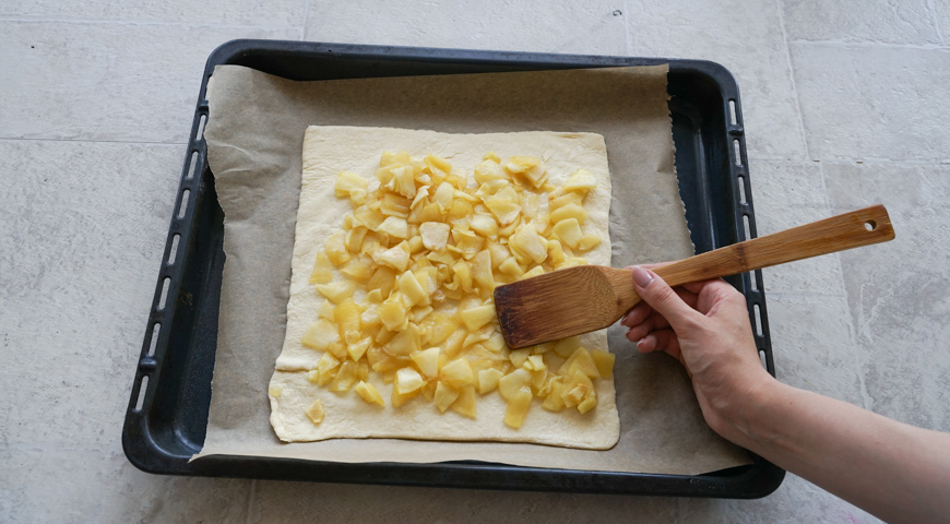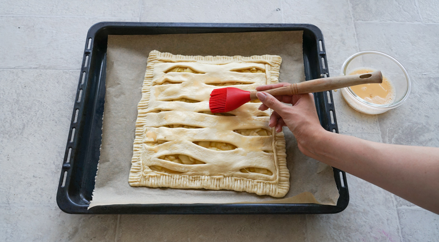 მზა ცომი დადეთ სამუშაო დაფაზე, დაჭერით ვაშლი წვრილად, გახსენით კარაქი ტაფაში. დაამატეთ ვაშლი და აურიეთ საშუალო ცეცხლზე 3 წუთის განმავლობაში. მოაყარეთ შაქარი და გააჩერეთ დაბალ ცეცხლზე, 8 წუთის განმავლობაში. გააბრტყელეთ ცომის ფენები, განათავსეთ ერთი ფენა საცხობ ფორმაზე მოთავსებულ ქაღალდზე. განათავსეთ თბილი და არა ცხელი, შაქრით შემწვარი ვაშლი ცომის ფენაზე და თანაბრად გაანაწილეთ. ვაშლებზე მოათავსეთ ცომის მზა ფენა. ცომის კიდეები შეაერთეთ და თითებით ან ჩანგლით მჭიდროდ დაამაგრეთ, რომ გამოცხობისას შიგთავსი არ გადმოიღვაროს. ათქვიფეთ კვერცხი და 1 ჩ.კ. წყალი, გადაუსვით ცომს და აცხვეთ 180 ° C ტემპერატურაზე, 12-15 წუთის განმავლობაში. მიირთვით თბილი.