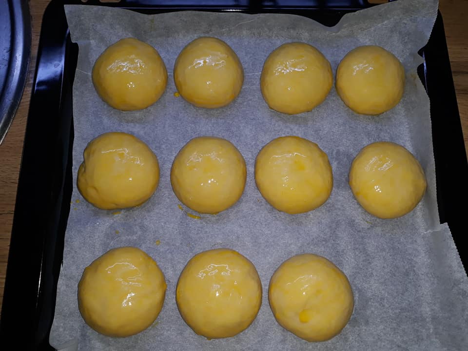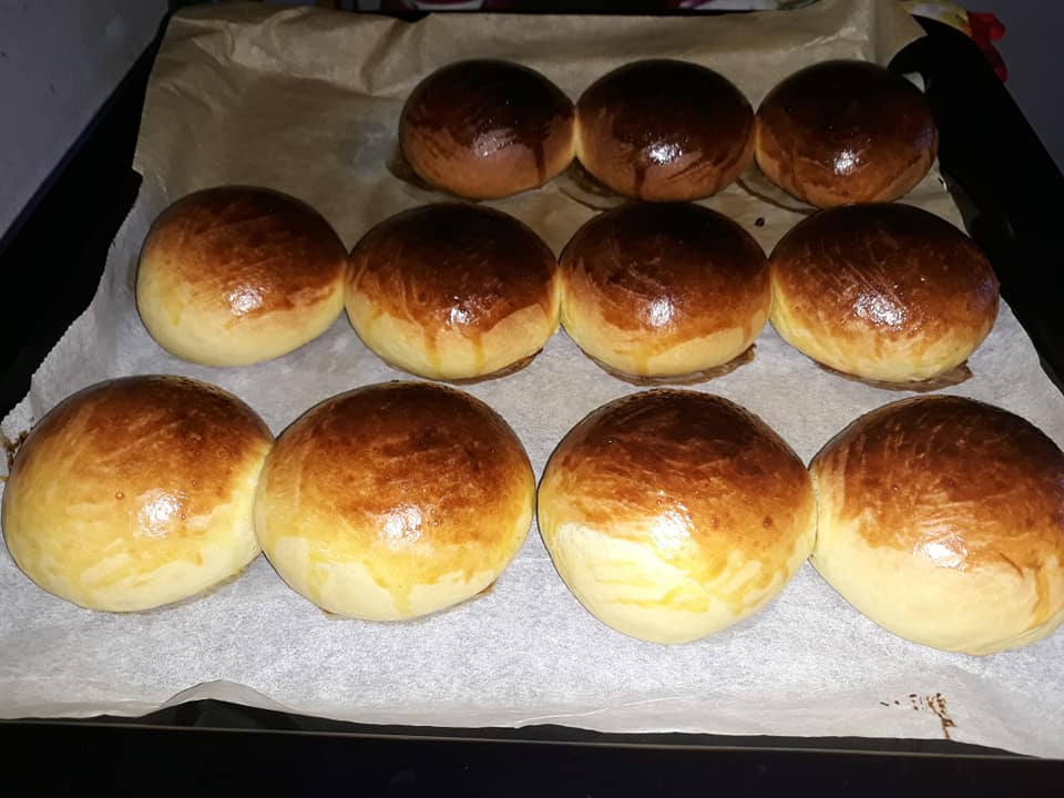 ყველა ინგრედიენტი (კარაქის გარდა) აურიეთ და შეკარით, სანამ ერთგვაროვან მასად არ აქცევთ. დაუმატეთ ოთახის ტემპერატურის კარაქი და ზილეთ ცომი 10 წუთის განმავლობაში, სანამ არ მიიღებთ ერთგვაროვან პრიალა მასას. შეფუთეთ ცომი და 1 საათი დაელოდეთ აფუვებას, სანამ მასა არ გაორმაგდება. ცომი დაყავით 80 გრ-იან გუნდებად, დაამრგვალეთ და მიეცით ფორმა, დაალაგეთ კალკადაფენილ საცხობ ფორმაზე და გრინი ან პარკი გადააფარეთ, გააჩერეთ 15-20წუთით, სანამ ცოტა კიდევ არ აფუვდება გუნდები. აფუების შემდეგ, გუნდებს ზემოდან წაუსვით 1 კვერცხის გულისა და ცოტა რძის ნაზავი. შედგით ღუმელში, რომელიც 180 გრადუსზე წინასწარ იქნება გახურებული. ზედა-ქვედა წვის რეჟიმზე, მოათავსეთ შუა ადგილას და გამოაცხვეთ 12-14 წუთით. ამ დროის გასვლის შემდეგ, გათიშულ ღუმელში გააჩერეთ 5წუთით. გემრიელად მიირთვით.