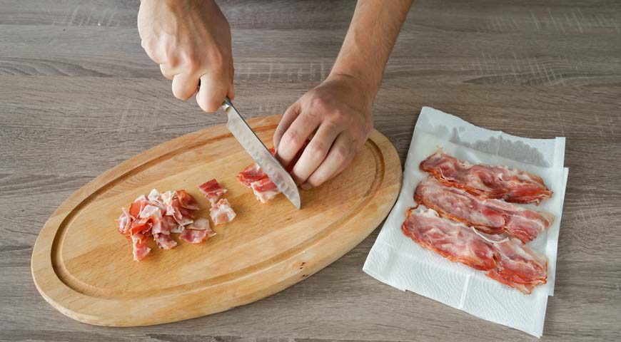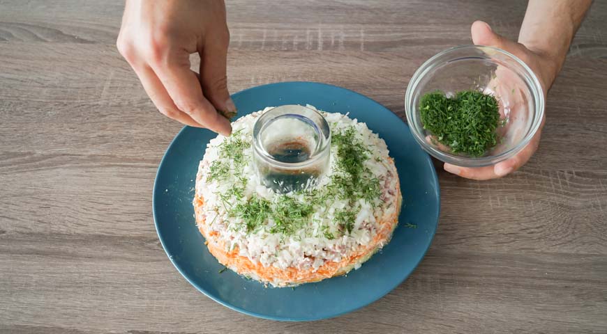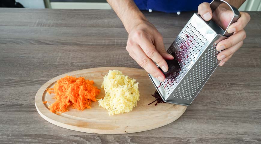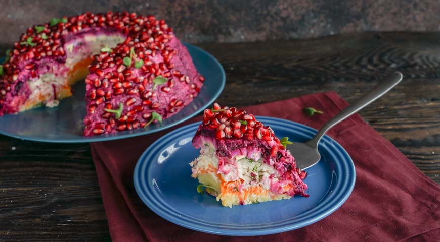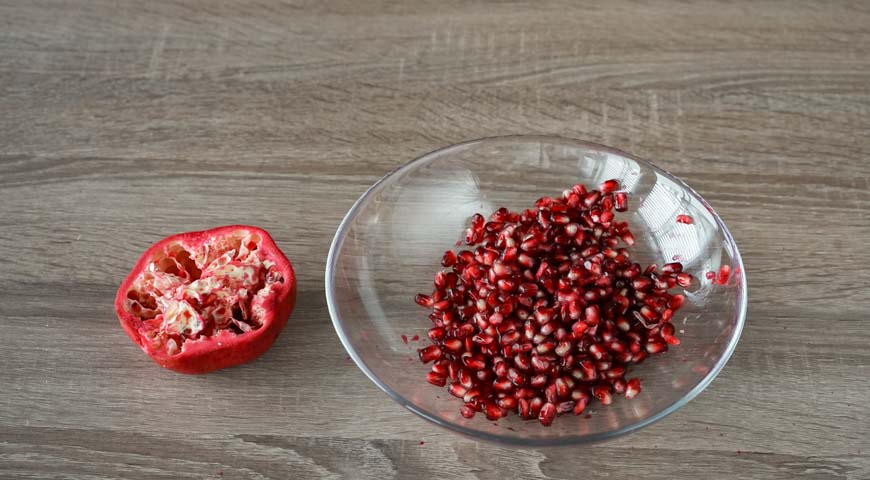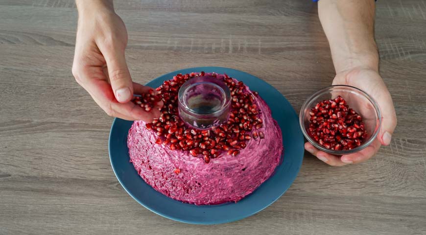 მოხარშეთ ჭარხალი, სტაფილო და კარტოფილი მარილიან წყალში. შემდეგ, გახეხეთ ბოსტნეული წვრილ სახეხზე. მოხარშეთ კვერცხი და წვრილად დაჭერით. ხახვი და კამა დაჭერით წვრილად და მოასხით ლიმონის წვენი. ბროწეული გაარჩიეთ და გადაიტანეთ თასში. ქათმის ფილე დაჭერით კუბიკებად. გახეხეთ ნიორი დანით და გააცალეთ კანი გაათბეთ ტაფა ზეითუნის ზეთით და შეწვით ბეკონი სალათისთვის, სანამ ორივე მხრიდან არ გახდება ოქროსფერი. გადაიტანეთ ქაღალდის ხელსახოცებზე ზედმეტი ზეთის მოსაშორებლად. როდესაც ბეკონი გაცივდება, დაჭერით პატარა ნაჭრებად. მოათავსეთ ხორცი ქვაბში და მოხარშეთ მაღალ ცეცხლზე, დაამატეთ ნიორი, აურიეთ სანამ არ დარბილდება, 5 წუთით. გადმოდგით და გააგრილეთ. თეფშის ცენტრში მოათავსეთ ჭიქა, რომელზეც ბროწეულის სამაჯურის სალათს გააწყობთ. სალათის პირველი ფენა არის კარტოფილი. შემდეგ, სტაფილო, ქათმისა და ბეკონის ნაჭრები, დაადეთ ხახვი და კამა. შემდეგ კვერცხის ფენა. შემდეგი ფენა არის ჭარხალი, მან უნდა დაფაროს სალათი ყველა მხრიდან. კარგად წაუსვით სალათი ბროწეულის სამაჯურს, გადააფარეთ სამზარეულოს ცელოფანი და შედგით მაცივარში 3 საათის განმავლობაში, შემდეგ კი ფრთხილად ამოიღეთ ჭიქა. შემდეგ, ისევ შედგით მაცივარში 3 საათის განმავლობაში.