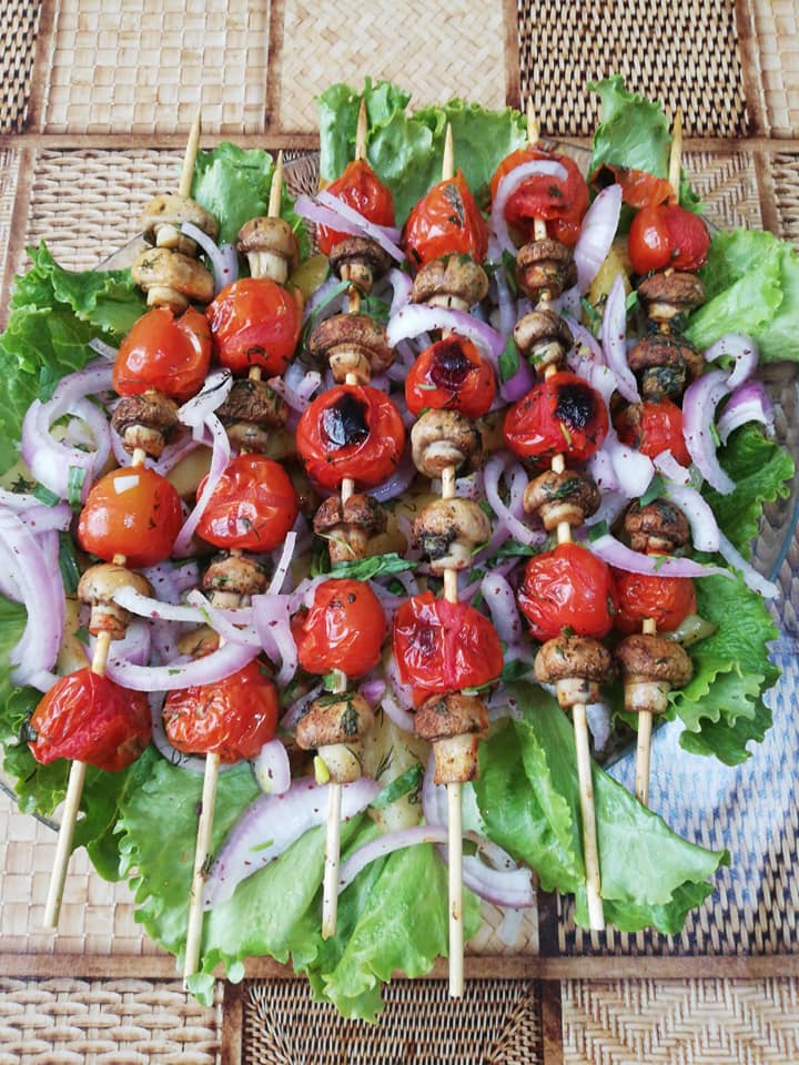 გასუფთავებულ შამპინიონს მოაყარეთ წვრილად დაჭრილი კამა, ახალი ხახვი, წიწაკა, პაპრიკა, მაიორანი, მარილი, პილპილი, ჩერი პომიდორი, ზეთი. კარგად აურიეთ და ააწყვეთ ხის შამფურზე, ჯერ სოკო, შემდეგ ჩერი, გადაიტანეთ კალკადაფენილ ფორმაზე. დარჩენილ მწვანილებს დაამატეთ დაჭრილი კარტოფილი, მოასხით ცოტა ზეთი, მექსიკური კარტოფილის საკმაზი, კარგად აურიეთ და მოალაგეთ ფორმას მრგვლად, შეწვით 200 გრადუსზე. დააფინეთ შუშის თეფშზე სალათის ფურცელი და შემწვარი სოკო გადაიტანეთ, მაღლიდან მოაყარეთ წითელი ხახვი, კოწახური და ცოტა ტარხუნა.