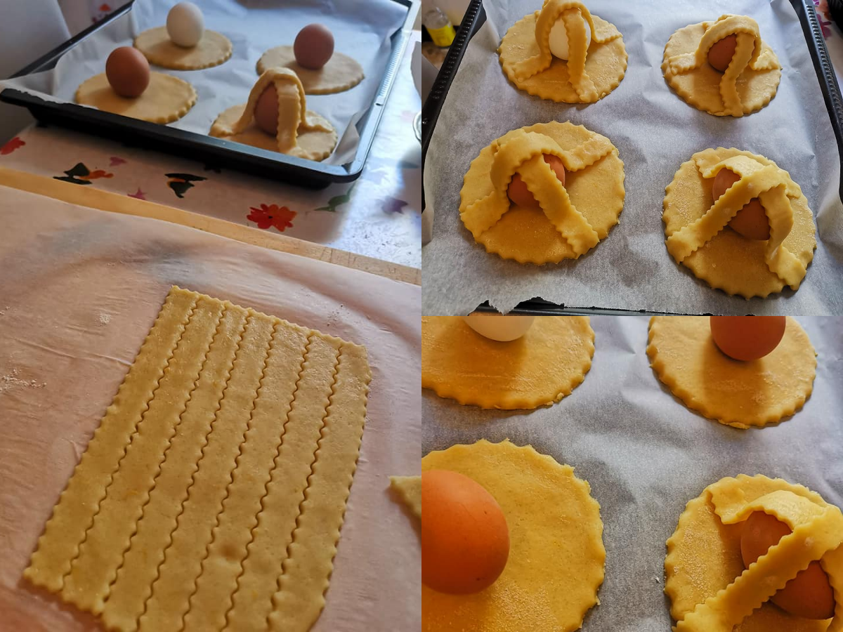 მოხარშული კვერცხი სურვილისამებრ, შეგიძლიათ ნახევარი კვერცხით მორთოთ და ნახევარი უკვერცხო ორცხობილები გამოაცხოთ. ამმონიაკა გამაფხვიერებელის მსგავსია, შეგიძლიათ მის ნაცვალდ ჩვეულებრივი გამაფხვიერებელი გამოიყენოთ. ორცხობილები მეტად ხრაშუნა გამოდის და დღეების შემდეგაც ინარჩუნებს სტრუქტურას. შეგიძლიათ ფერადი, შეღებილი კვერცხიც გამოიყენოთ. ფქვილი მოათავსეთ თასსში, გაუკეთეთ ღრმული შუაში, ცოტა რძეში გახსენით ამმონიაკა. თუ გამაფხვიერებელს გამოიყენებთ, მაშინ არ არის საჭირო რძეში გახსნა. მოათავსეთ ყველა ინგრედიენტი და მოზილეთ ცომი. გააბრტყელეთ, გამოჭერით სასურველი ფორმა, ნებისმიერი ფორმა შეგიძლიათ გააკეთოთ. კვერცხები წინასწარ მოხარშეთ ძალიან კარგად, 8-9 წუთით მაინც, დაადეთ გამოჭრილ ფორმას, მორჩენილი ცომიდან მოგრძო ზოლები გამოჭერით და ჯვრის ფორმით დაადეთ ზემოდან, როგორც სურათზეა. ცალკე ათქვიფეთ 1 მთლიანი კვერცხი და გადაუსვით ზემოდან, მოაყარეთ ფერადი შაქარი და გამოაცხვეთ გახურებულ ღუმელში 15-20 წუთით.