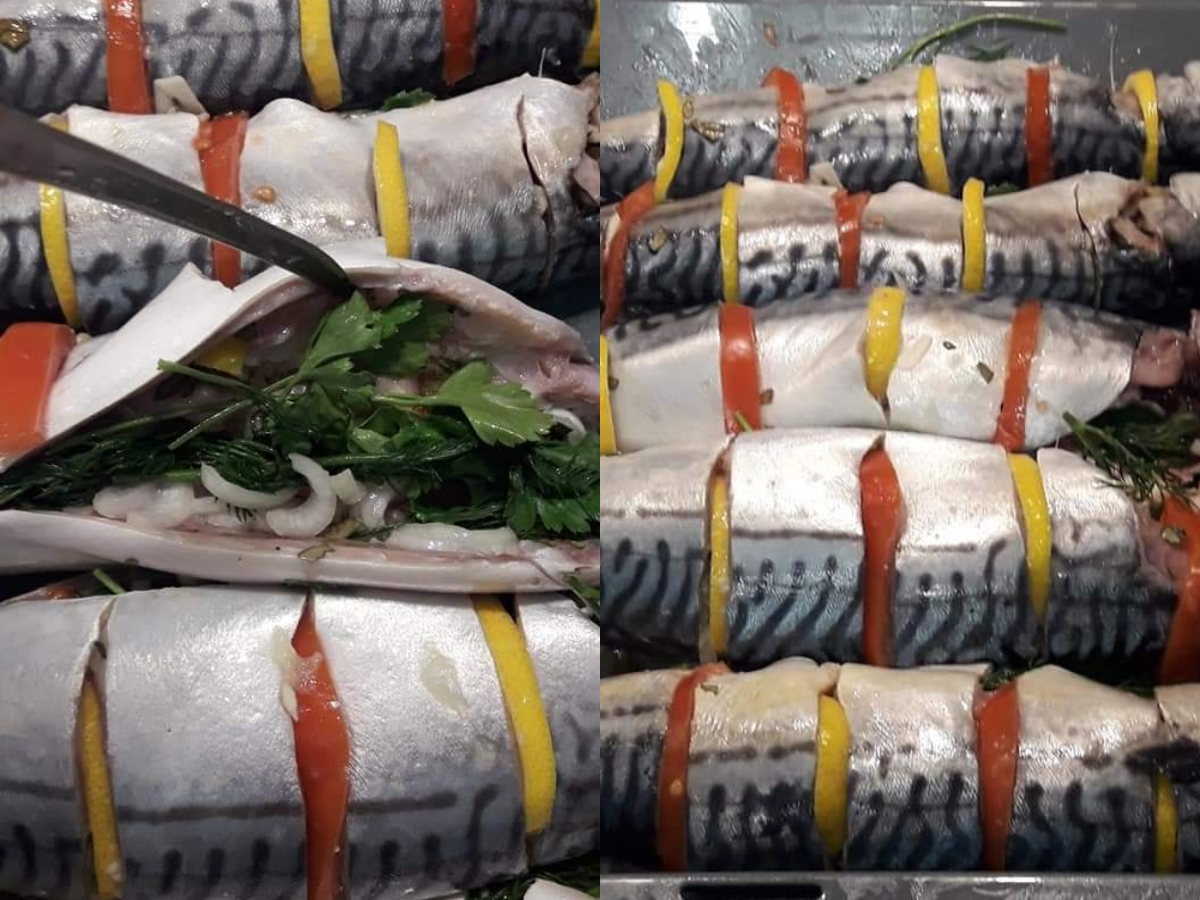 კარგად გაწმინდეთ და გარეცხეთ სკუმბრია, დაალაგეთ საწურზე რამოდენიმე წუთით, რომ ზედმეტი წყლისგან დაიწუროს. დასერეთ სასურველი ზომის ნაჭრებად, გადაიტანეთ თასში, წაუსვით მარილი, მოაყარეთ დასრესილი დაფნის ფოთოლი და მოაწურეთ ცოტა ლიმონის წვენი. დადგით ცივ ადგილას, 1- 2 საათის განმავლობაში. დამარინადებული თევზი გადაიტანეთ საცხობ ფორმაზე, თითოეულ თევზში მოათავსეთ შიგთავსი: ნახევარ რგოლებად დაჭრილი ხახვი, წვრილად დაჭრილი ნიორი, თითო ღერი ოხრახუში და ცერეცო. დასერილ ჭრილებში თანმიმდევრობით ჩადეთ რგოლებად დაჭრილი ლიმონი და პომიდორი, როგორც ფოტოზეა. თევზმა ცხობის დროს რომ არ დაიკროს, ჩააწყვეთ კარტოფილის ან ხახვის ბალიშზე. კარტიფილი დაჭერით გრძლად, საშუალო სისქეზე და თევზს დაუდეთ ქვემოდან, ზემოდან დააფარეთ ფოლგა და შედგით გახურებულ ღუმელში, გამოაცხვეთ 200°-ზე. დაახლოებით 20 წუთის შემდეგ ახადეთ ფოლგა და გააგრძელეთ ცხობა რომ ზემოდან შეწითლდეს. არის ძალიან გემრიელი და წვნიანი.