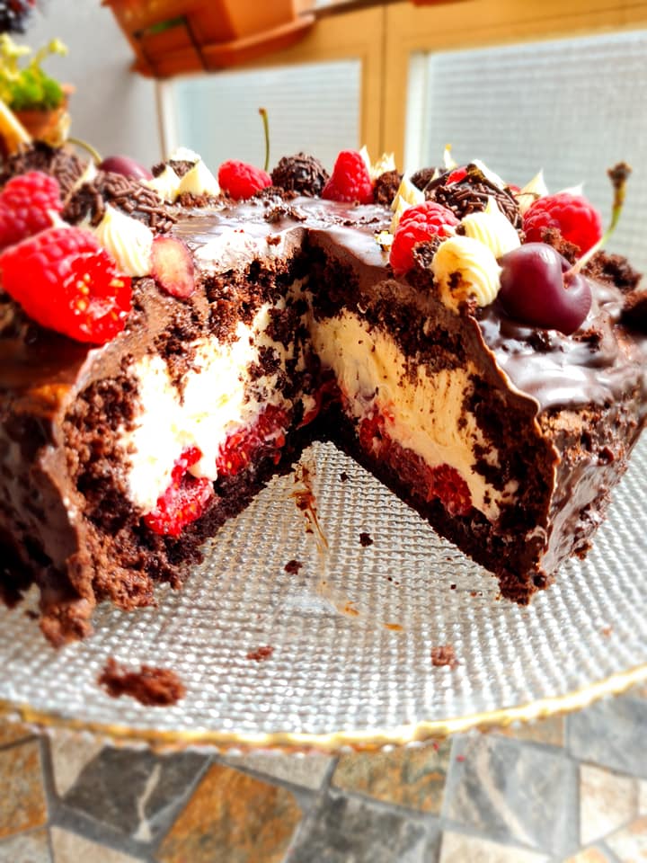 გაადნეთ კარაქი, 6 კვერცხის გული ათქვიფეთ 100გრ შაქართან ერთად, დაამატეთ სოდა ძმრით, ან გამაფხვიერებელი დაუმატეთ ფქვილში. ამოვიყვანეთ ცილა მწიკვ მარილთან ერთად, დაუმატეთ 100 გრ შაქარი და გააკეთეთ ფუმფულა ბეზე. ცილას გადაურიეთ გულები, სილიკონის კოვზით. 2 ნაწილად ჩააცერით ფქვილში არეული კაკაო და გადაურიეთ. შემდეგ 2 კოვზი ცომი აურიეთ გამდნარ კარაქში და ეს მასა გადაურიეთ მთლიან ცომს. გამოაცხვეთ 160°-ზე, კონვექციით, დაახლოებით 30 წუთით. შეამოწმეთ ხის ჩხირით. კრემის მომზადება: (შეგიძლიათ გააკეთოთ თქვენთვის საყვარელი მოხარშული კრემის რეცეპტით) დადგით რძე ასადუღებლად, გააკეთეთ გოგლი-მოგლი, დაუმატეთ ფქვილი და სახამელები, 1 ყავის ჭიქა ცხელი რძე და გააერთიანეთ მასა. როცა რძე დაიწყებს დუღილს, ჩაუშვით მზა მასა ნელ–ნელა და მოურიეთ მუდმივად, გასქელდება და მზადაა. ცხელში დაამატეთ ვანილი და 50 გრ კარაქი. დადგით გასაგრილებლად. ათქვიფეთ ოთახის ტემპერატურის კარაქი, შეგიძლიათ დაუმატოთ ნახევარი ქილა შესქელებილი რძე და გაგრილებული ფაფა. მინანქრის მომზადება: შიგთავსი ალუბალი და ჟოლო. დანამეთ ალუბლის წვენით, შეგიძლიათ ხილი ცოტახნით გააჩეროთ კონიაკში. ბისკვიტიდან ამოიღეთ გული, დანამეთ გვერდები და ძირი. მოალაგეთ ხილი და ჩაასხით კრემი. ზემოდან მოაყარეთ დატეხილი ბისკვიტი. ცოტა ზემოდანაც დანამეთ და გააგრილეთ. ამასობაში გააკეთეთ მინაქარი, შოკოლადს დაასხით ადუღებამდე მიყვანილი ნაღები. დააცადეთ 3-4 წუთი. აურიეთ და შემდეგ მოსახით ტორტს. მორთეთ სურვილისა და გემოვნების მიხედვით.