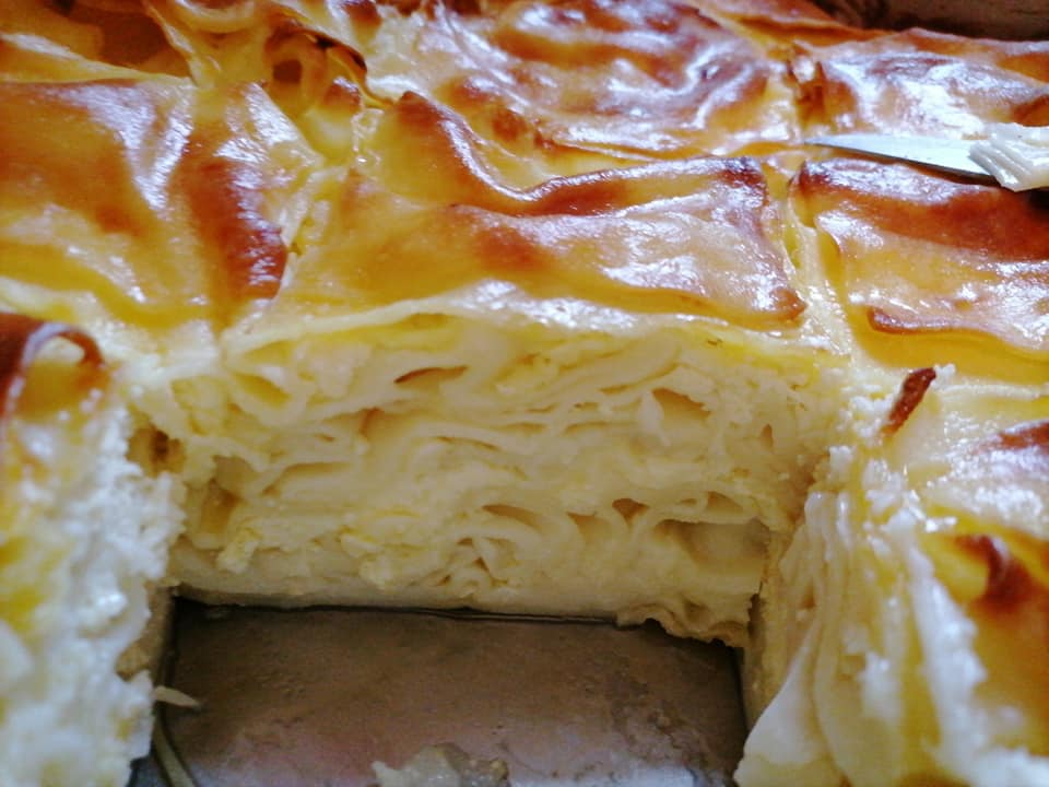 5 კვერცხი ათქვიფეთ მარილთან და ცოტა გამდნარ კარაქთან ერთად. დაუმატეთ 500 მლ ოთახის ტემპერატურის წყალი. კარგად რომ გახსნით, ნელ-ნელა დაუმატეთ 1.500გრ ფქვილი (უმაღლესი ხარისხის). მიღებული ცომი ჩადეთ აპარატში და კარგად მოაზელინეთ. შემდეგ, ცომს მიეცით გრძელი ფორმა და დაყავით 9 ნაჭრად. ორი გუნდა, შედარებით მოზრდილები გააკეთეთ. პირველი და ბოლო ფენა, როგორც იცით, არ იხარშება. ყველა ფენას წაუსვით გამდნარი კარაქი (ფუნჯით) მე-4 და მე-7 ფენას მოაყარეთ ყველი(იმერული). შედგით ღუმელში და 25 წუთის შემდეგ წაუსვით რძეში გახსნილი 2 კვერცხის გული. შეატრიალეთ ღუმელში, სანამ კარგად არ დაიბრაწება.