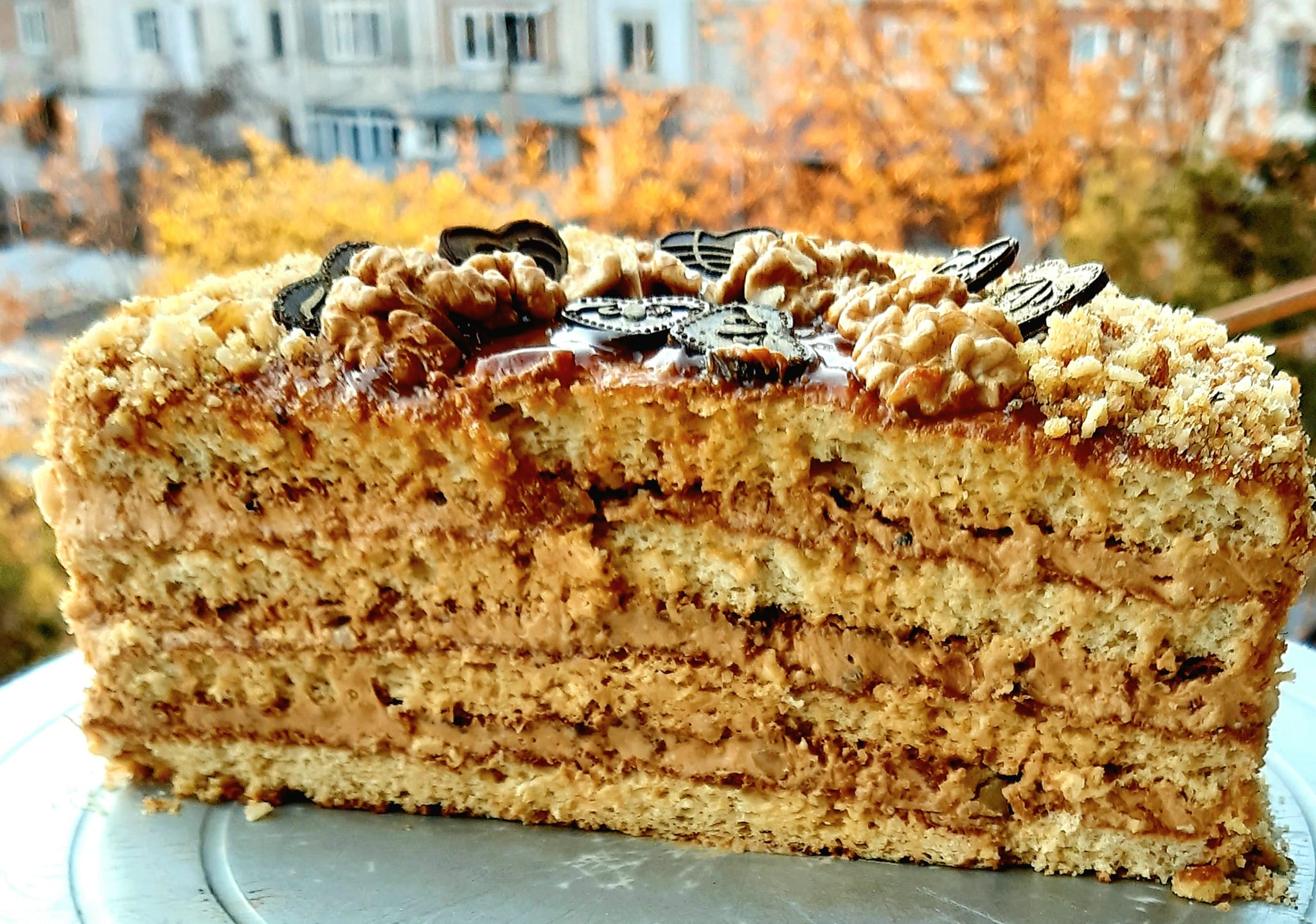 ააცალეთ კვერცხს ცილები, მწ.მარილთან და შაქართან (100გრ) ათქვიფეთ მიქსერით თეთრი და მყარი ბეზეს მიღებამდე. ცალკე ჯამში შეუერთეთ კვერცხის გულები, დარჩენილი 30გრ შაქარი, თაფლი, სოდა, მოურიეთ კარგად და ფრთხილად დაუმატეთ ბეზეს მასასთან, სილიკონის კოვზით ფრთხილად მოურიეთ, დაუმატეთ გაცრილი ფქვილი, შეურიეთ. საკონდიტრო ქაღალდზე უნდა წაუსვათ თანაბრად, სასურველ ზომის ბისკვიტი და გამოაცხვეთ 190-200°-ზე, შეწითლებამდე. ამ ინგრედიენტებით გამოვიდა 4 ცალი, 20სმ დიამეტრის ბისკვიტები. გათქვიფეთ კარაქი, დაუმატეთ მოხარშული შესქელებული რძე, კოვზებით ნაღები და ბოლოს ვანილინი. გაფორმება-სურვილისამებრ.