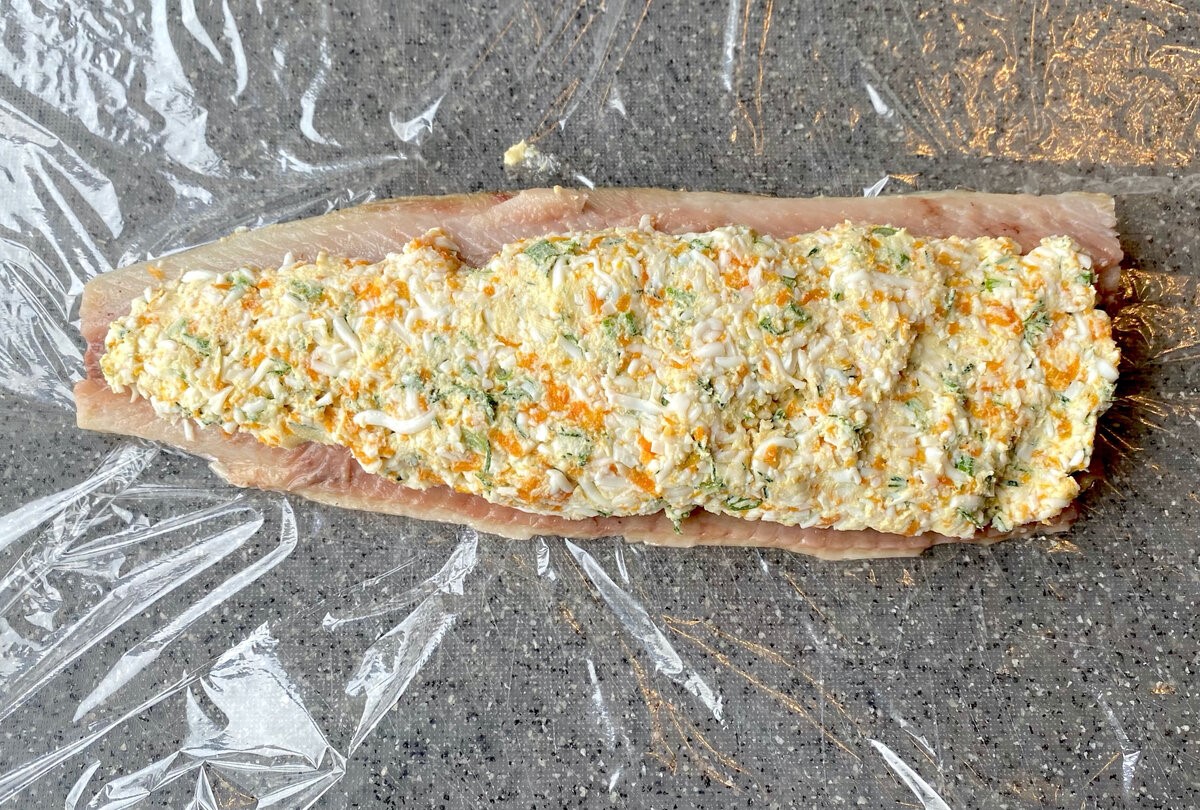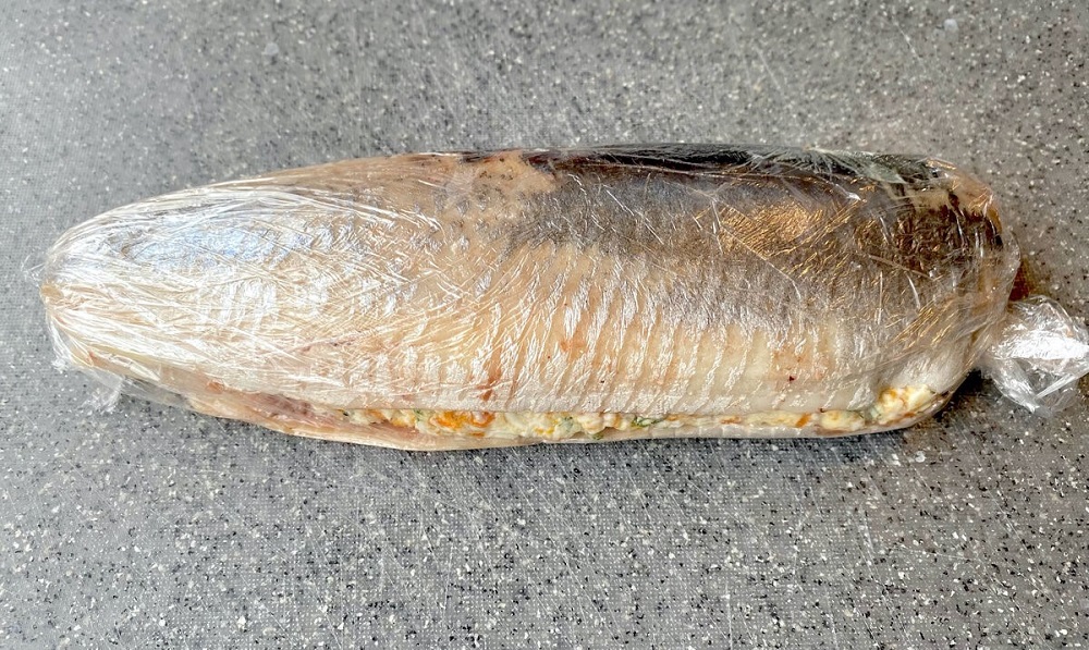თევზის ნახევარი დადეთ საკვებ პოლიეთილენის პარკზე, დაადეთ შიგთავსი, გადაანაწილეთ თანაბრად. დააფარეთ მეორე ნახევარი, გადაახვიეთ პარკში და შედეთ საყინულეში 10 წუთით.