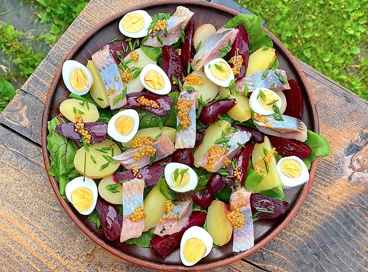 ქაშაყიც დაჭერით. ყველაფერი ლამაზად გადაიტანეთ ჭარხლის ფოთლებ დაფენილ თეფშზე, მორთეთ მარცვლოვანი მდოგვით და მწვანე ხახვით.