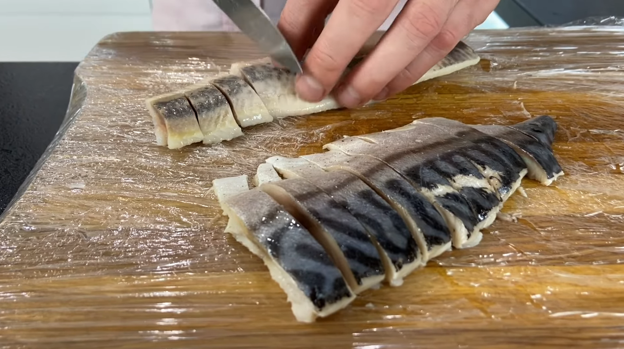 წითელი თევზი, ქაშაყი და სკუმბრიის ფილე დაჭერით პატარა ნაჭრებად.