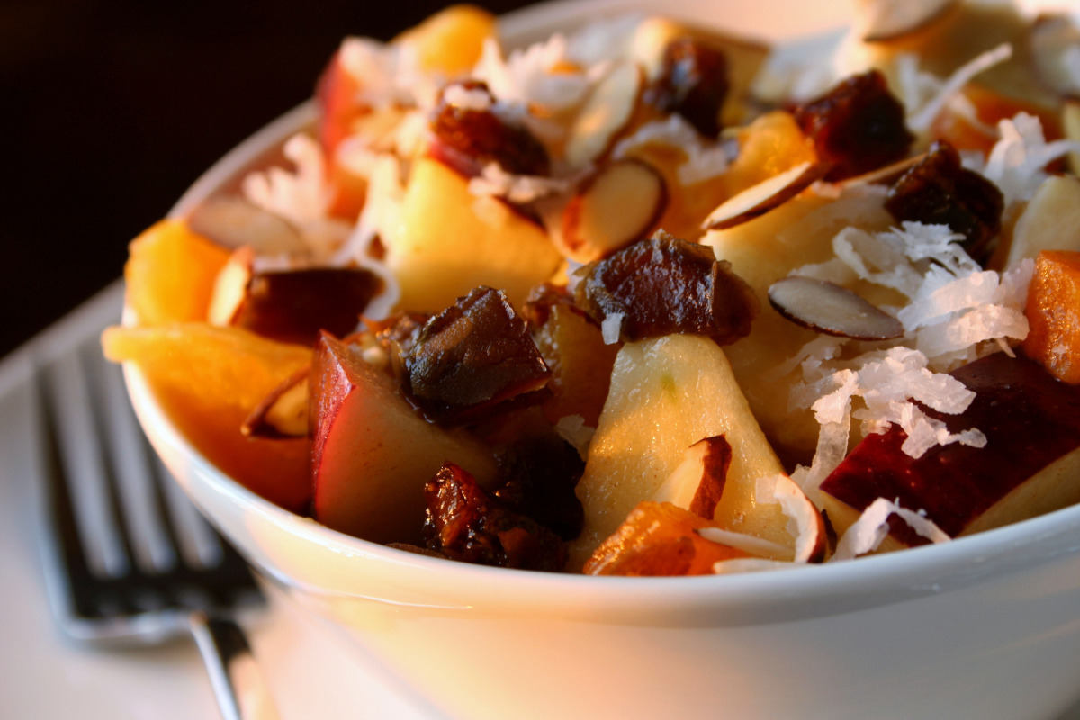 2. საზაფხულო ხილის სალათი ფინიკის ჩირითა და მაკადამიას ტოპინგით