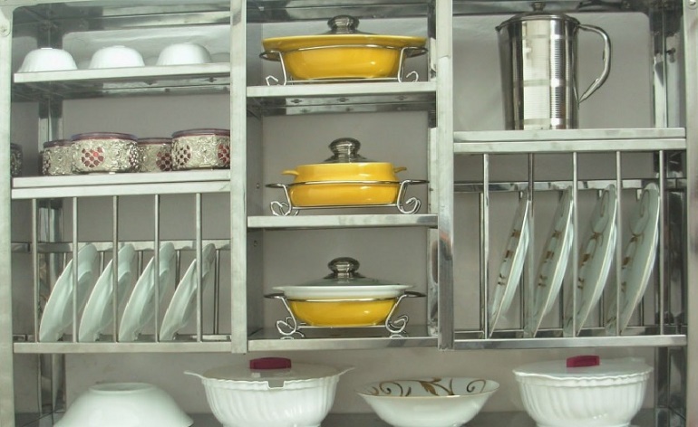 თუ თაროების მორგება არ შეგიძლიათ, შეგიძლიათ გამოიყენოთ თეფშების სათავსოები საჭირო ნივთების შესანახად. კიდევ ერთი უპირატესობა ის არის, რომ ისინი ადვილად ირეცხება.