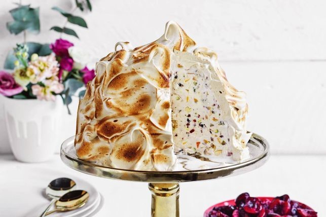 - პუდინგის აწყობა: პუდინგის ფორმიდან ამოიღეთ ნაყინი, მოხსენით პერგამენტის ქაღალდი. სუფთა კოვზით წაუსვით მერინგა ნაყინზე დეკორატიულად.