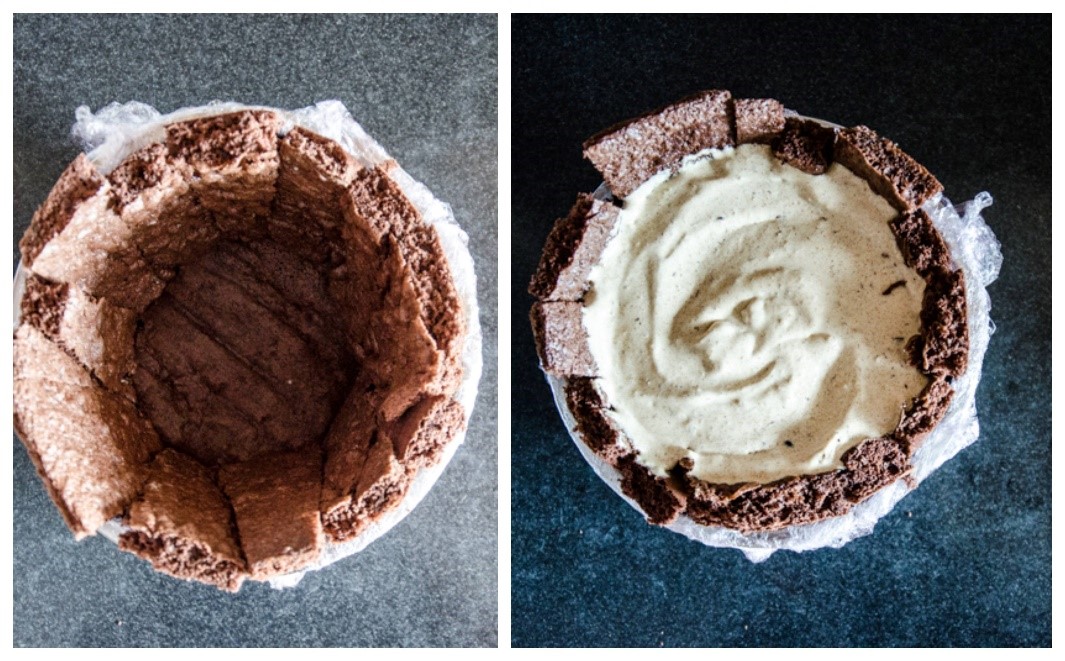 - ტორტის ბისკვიტი მოათავსეთ ფორმის ფსკერზე. შემდეგ ტორტის ნაჭრებით დაფარეთ ფორმის გვერდები, მაქსიმალურად შეამცირეთ ღარები.