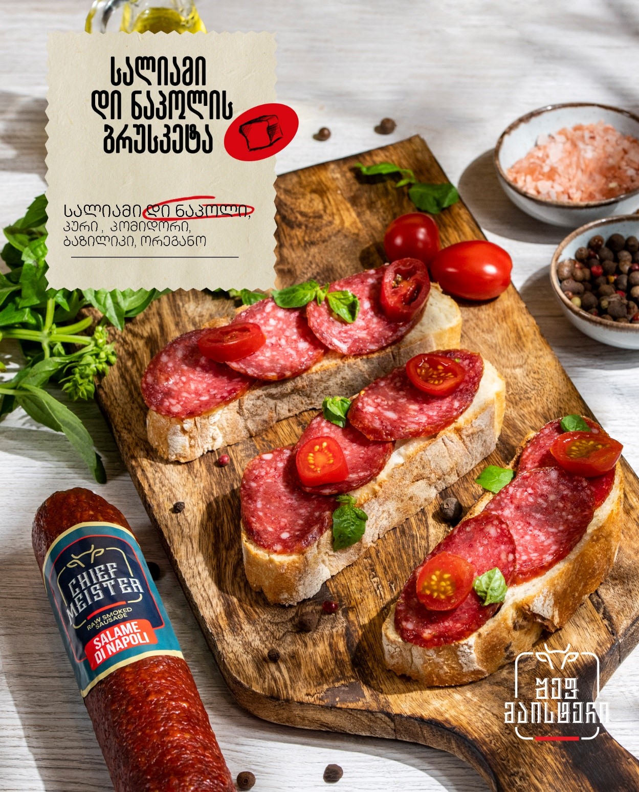 რაც შეეხება ხემსს, მარტივი და სწრაფი იდეაა ხრაშუნა იტალიური ბრუსკეტები “შეფმაისტერის“ “სალამი დი ნაპოლით“. დაგჭირდებათ: “შეფმაისტერის“ გამორჩეული, ნედლად შებოლილი პროდუქტი “სალიამი დი ნაპოლი“, ხრაშუნა პური, პომიდორი და ორეგანო. ბოლოს კი იტალიური სამზარეულოს განუყოფელი ნაწილი, არომატული ბაზილიკი!