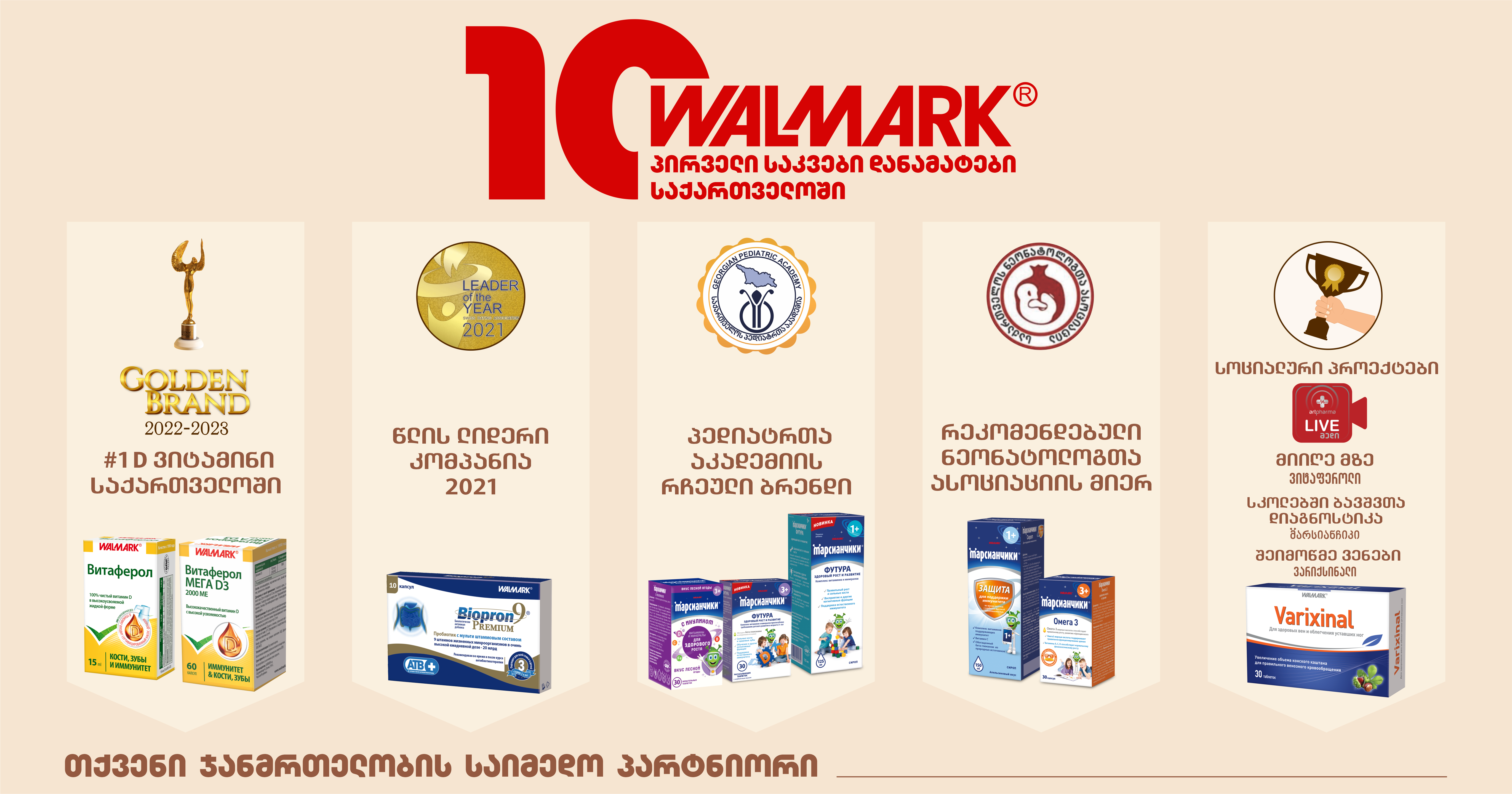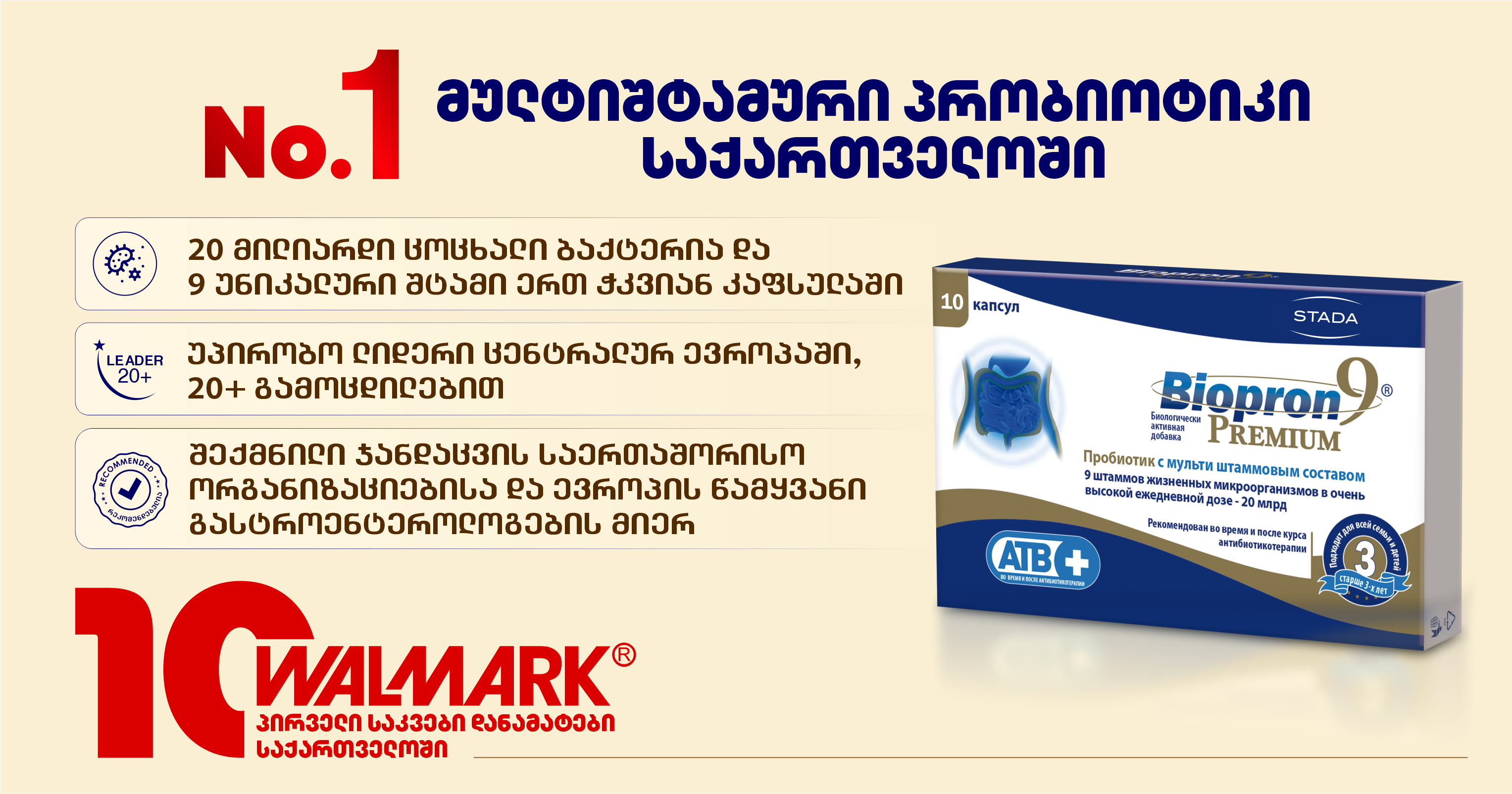 „კუჭ-ნაწლავის ჯანმრთელობაზე ზრუნვა ერთ-ერთი ყველაზე მნიშვნელოვანი პრიორიტეტია, რადგან ისეთი გამოწვევები, როგორიცაა მუცლის გადავსება, ყაბზობა, დიარეა, წონის მატება თუ ანტიბიოტიკოთერაპიით გამოწვეული მიკროფლორის დარღვევა, მნიშვნელოვნად ამცირებს ყოველდღიურ ენერგიასა და ცხოვრების ხარისხს. „ბიოპრონ 9 პრემიუმი“, თავისი უნიკალური მულტიშტამური შემადგენლობით გამოირჩევა ბაზარზე კონკურენტული უპირატესობებით და ეფექტურად უწყობს ხელს ნაწლავის ჯანმრთელობის აღდგენას. მისი მაღალი მოთხოვნა, რაც ზოგჯერ დროებით დეფიციტსაც კი იწვევს, მისი განსაკუთრებული ხარისხისა და მრავალფეროვანი სარგებლის დასტურია. ჩვენი გუნდი აქტიურად მუშაობს, რათა „ბიოპრონი” ყოველთვის ხელმისაწვდომი იყოს მომხმარებლისთვის. ვამაყობთ, რომ Walmark-ის 10-წლიანი საქმიანობის განმავლობაში „ბიოპრონი“ ერთ-ერთია, რომელმაც მოიპოვა ქართველი მომხმარებლებისა და სამედიცინო საზოგადოების ნდობა და გახდა ჯანმრთელობისა და თანამედროვე, დატვირთული ცხოვრების სტილის განუყოფელი მხარდამჭერი“, – აღნიშნავს საქართველოში Walmark-ის წარმომადგენლობის, ფარმაცევტული კომპანია „არტფარმას“ ბრენდ პორტფოლიოს განვითარების მენეჯერი, თიკო ლომინაძე.